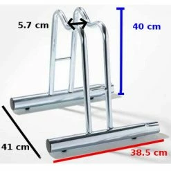 Ce parking pèse 2.4 kg et mesure 41 x 38.5 x 40 cm. Il est possible d’emboîter plusieurs de ces râteliers entre eux afin d’obtenir un parking pour plusieurs vélos selon les besoins. Il est possible de l’assembler avec un garage vélo bas, ce qui évite aux guidons de deux vélos côte à côte de se gêner. Également disponible, le garage 3 vélos à freins à disque.