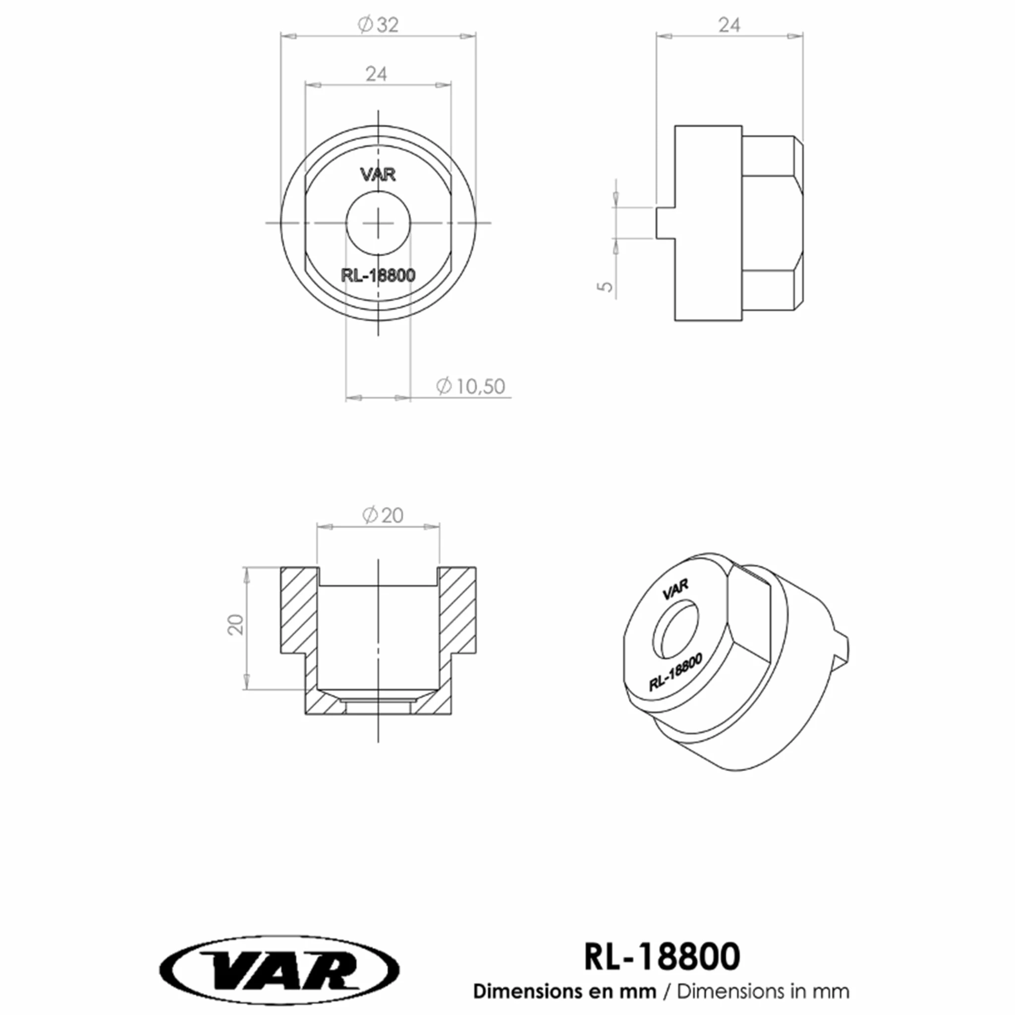 Le démonte roue-libre deux ergots Var RL-18800 sert à démonter les roues libres Cyclo et Régina 4/5/6 vitesses à axe plein. Avec un diamètre interne de 10.5 mm et un diamètre externe de 32 mm, le produit s’utilise avec une clé de 24, ainsi qu’un fouet à chaine et une pince à cassette.