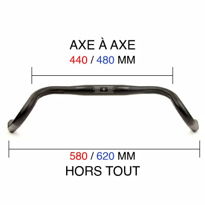 - 620 mm : le cintre possède une largeur hors-tout de 620 mm, une largeur d’axe à axe de 480 mm, et un poids de 314 g.